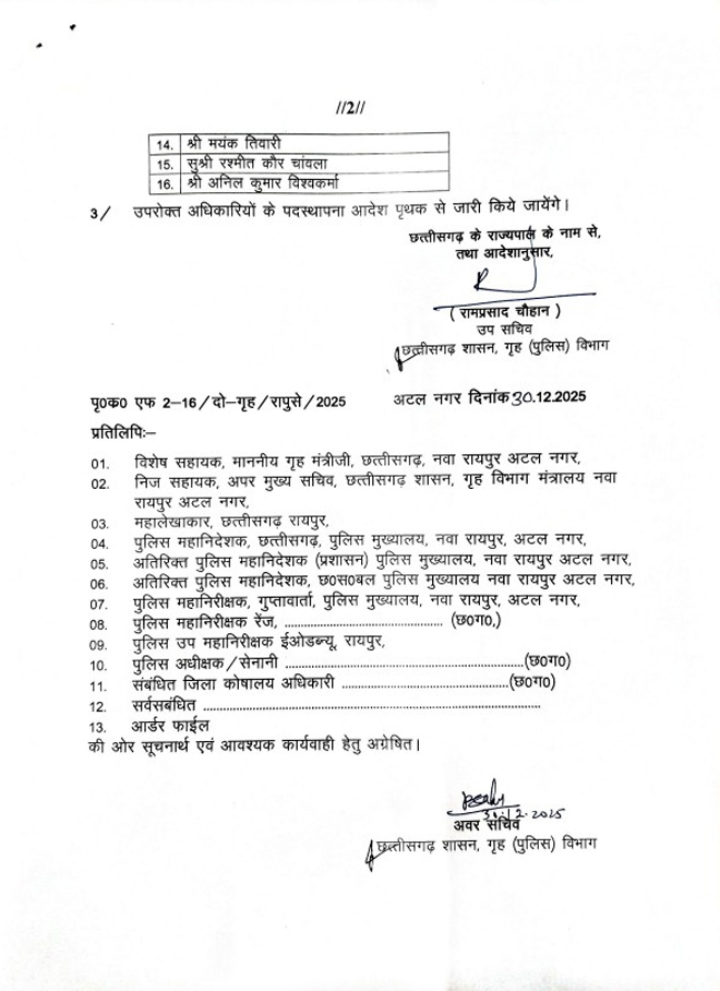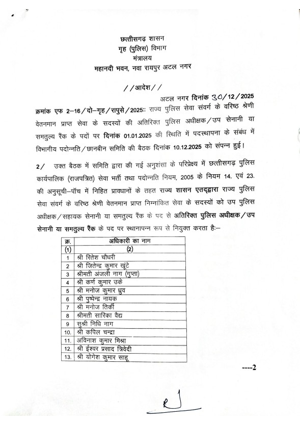 रायपुर : नए साल के पहले राज्य सरकार ने राज्य पुलिस सेवा के 16 अफसरों का प्रमोशन किया. इन अधिकारियों में रितेश चौधरी, जितेन्द्र कुमार खूंटे, अंजली नाग (गुप्ता), कर्ण कुमार उके, मनोज कुमार ध्रुव, पुष्पेन्द्र नायक, मनोज तिर्की, सारिका वैद्य, निधि नाग, कपिल चन्द्रा, अविनाश कुमार मिश्रा, ईश्वर प्रसाद त्रिवेदी, योगेश कुमार साहू, मयंक तिवारी, रश्मीत कौर चांवल और अनिल कुमार विश्वकर्मा का नाम शामिल हैं. इसे लेकर गृह विभाग ने आदेश जारी किया है.