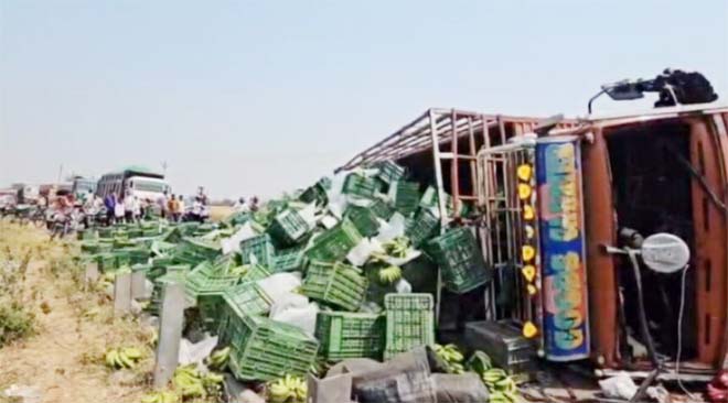 अचानक टायर फटने से सड़क पर पलटा केला लदा माजदा, वाहनों की थमी रफ्तार, लगी लंबी कतार