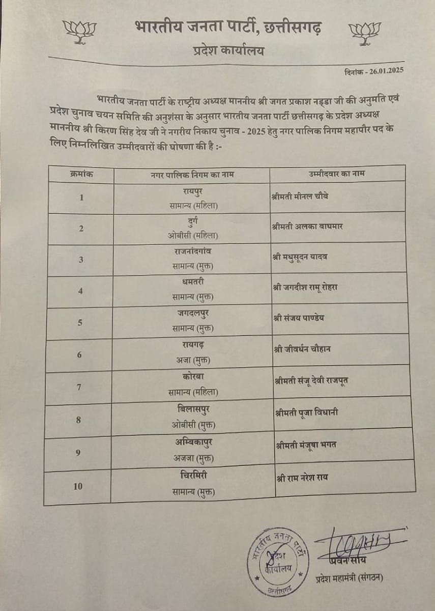 रायपुर: BJP (भारतीय जनता पार्टी) के राष्ट्रीय अध्यक्ष जगत प्रकाश नड्डा की अनुमति और प्रदेश चुनाव चयन समिति की अनुशंसा के अनुसार भारतीय जनता पार्टी छत्तीसगढ़ के प्रदेश अध्यक्ष किरण सिंह देव ने नगरीय निकाय चुनाव 2025 हेतु नगर पालिका निगम महापौर पद के लिए निम्नलिखित उम्मीदवारों की घोषणा की है.