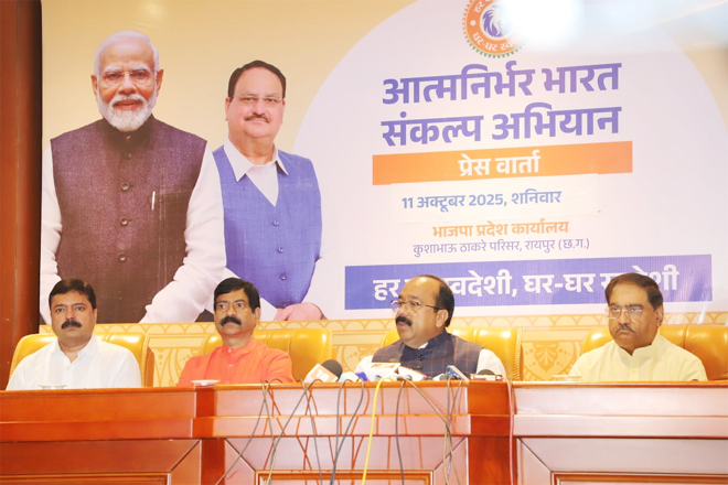 उप मुख्यमंत्री श्री साव ने देश की अर्थव्यवस्था में आए क्रांतिकारी बदलाव के लिए प्रधानमंत्री श्री मोदी के नेतृत्व में केंद्र सरकार की जनकल्याणकारी योजनाओं व कार्यक्रमों की महती भूमिका की चर्चा की और कहा कि देश का जनमानस आत्मनिर्भर भारत के अभियान से अपने आप को जोड़ चुका है। यही भावना आत्मनिर्भर भारत का मूल तत्व है। छत्तीसगढ़वासी दैनिक जीवन में राष्ट्रभक्ति का परिचय देते हुए स्थानीय कलाकारों, उत्पादकों की बनाई हुई चीजों का इस्तेमाल करें। उप मुख्यमंत्री श्री साव ने कहा कि दीपावली पर यह हमारा बहुत बड़ा योगदान होगा कि अपने नजदीक में रहने वाले अपने लोगों के पसीने से बनी हुई चीजों की ही खरीदी करें ताकि उनके परिवार भी अच्छी तरह दीपावली मना पाएँ। उप मुख्यमंत्री श्री साव ने कहा कि इस अभियान को जन-जन तक पहुँचाने के लिए आत्मनिर्भर भारत संकल्प सम्मेलन और आत्मनिर्भर भारत संकल्प रथ यात्रा सहित प्रदर्शनी और स्वदेशी मेले जैसी कई गतिविधियों की योजना बनाई गई है। आत्मनिर्भर भारत संकल्प अभियान महात्मा गांधी और पंडित दीनदयाल उपाध्याय के आदर्शों से प्रेरणा लेते हुए, भारत की संस्कृति, परंपरा और आत्मा को और अधिक सशक्त बनाने का संकल्प है। श्री साव ने मीडिया जगत से भी इस अभियान से जुड़ने की अपील की और कहा कि मीडिया जगत के साथियों को हम स्वदेशी संकल्प पत्र भेजेंगे। पत्रकार वार्ता के दौरान भाजपा प्रदेश महामंत्री यशवंत जैन, प्रदेश कोषाध्यक्ष राम गर्ग, प्रदेश कार्यालय मंत्री अशोक बजाज, जिला अध्यक्ष रायपुर शहर रमेश सिंह ठाकुर, जिला अध्यक्ष रायपुर ग्रामीण श्याम नारंग मौजूद रहे।