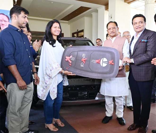 रायपुर : मुख्यमंत्री श्री विष्णुदेव साय ने आज नवा रायपुर स्थित अपने निवास में आयोजित एक गरिमामय समारोह में भारतीय महिला क्रिकेट टीम की फिजियोथेरेपिस्ट और छत्तीसगढ़ की बेटी श्रीमती आकांक्षा सत्यवंशी को टाटा सिएरा कार उपहार स्वरूप प्रदान की। इस अवसर पर मुख्यमंत्री ने श्रीमती आकांक्षा को बधाई देते हुए कहा कि हमारी बेटियों ने विश्व कप जीतकर देश का गौरव बढ़ाया है। उन्होंने महिला क्रिकेट टीम के सम्मान और प्रोत्साहन के लिए टाटा मोटर्स द्वारा कार उपहार देने की इस पहल की सराहना की।