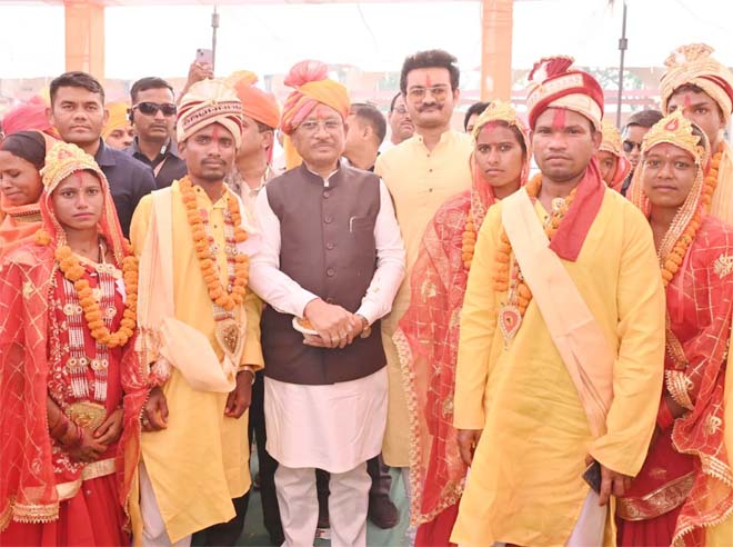 रायपुर : मुख्यमंत्री श्री विष्णुदेव साय आज जशपुर के रणजीता स्टेडियम में मुख्यमंत्री कन्या विवाह योजना के अंतर्गत आयोजित सामूहिक विवाह समारोह में शामिल हुए, जहां 240 नवविवाहित जोड़ों का विवाह विधिवत सम्पन्न हुआ। मुख्यमंत्री श्री साय विवाह मंडप में पहुंचकर नवदंपतियों के बीच गए और उन्हें शुभाशीष प्रदान करते हुए उनके सुखद, समृद्ध एवं मंगलमय दांपत्य जीवन की कामना की। कार्यक्रम का वातावरण पारंपरिक रीति-रिवाजों, वैदिक मंत्रोच्चार और सामाजिक एकता के भाव से ओतप्रोत रहा।