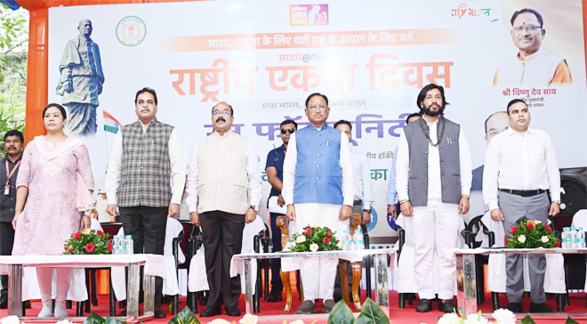रायपुर : देश के प्रथम उप प्रधानमंत्री एवं गृह मंत्री सरदार वल्लभभाई पटेल अपनी कर्मठता और दृढ़ इच्छाशक्ति से लौहपुरुष बने। आज़ादी के बाद के कठिन हालातों में उन्होंने अपनी सूझबूझ और फौलादी इरादों से 562 रियासतों का भारत में विलय कर अखंड भारत का निर्माण किया। किसानों के संघर्ष और स्वतंत्रता आंदोलन में उनका योगदान अमूल्य रहा है। मुख्यमंत्री श्री विष्णु देव साय ने आज सरदार वल्लभभाई पटेल की 150वीं जयंती के अवसर पर आयोजित राष्ट्रीय एकता दिवस कार्यक्रम में यह बात कही। यह कार्यक्रम खेल एवं युवा कल्याण विभाग द्वारा रायपुर स्थित सरदार वल्लभभाई पटेल अंतरराष्ट्रीय हॉकी स्टेडियम में आयोजित किया गया।इस अवसर पर उप मुख्यमंत्री एवं खेल एवं युवा कल्याण मंत्री श्री अरुण साव, कौशल विकास, तकनीकी शिक्षा एवं रोजगार मंत्री श्री गुरु खुशवंत साहेब तथा विधायक श्री राजेश मूणत उपस्थित थे।