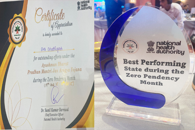 यह सम्मान राज्य के अथक प्रयासों और स्वास्थ्य क्षेत्र में अनुकरणीय कार्यशैली का प्रमाण है। सम्मान देने के मुख्य कारण पहचान किए गए सभी मुद्दों पर गहन फील्ड ऑडिट का सफलतापूर्वक आयोजन किया गया। आयुष्मान योजना के दावा प्रक्रिया में टर्नअराउंड टाइम को उल्लेखनीय रूप से घटाया गया, जिससे लाभार्थियों को त्वरित सेवाएं मिलीं। सभी संबंधित हितधारकों की विस्तृत संवेदनशीलता और जागरूकता कार्यक्रमों का संचालन कर उन्हें जागरूक बनाया गया। एनएचए की पैनल्ड स्वास्थ्य सेवा प्रदाताओं के साथ प्रभावी संचार तंत्र स्थापित कर समन्वय को बेहतर किया गया। छत्तीसगढ़ सरकार का यह प्रयास राज्य के नागरिकों को गुणवत्तापूर्ण और सुलभ स्वास्थ्य सेवाएं उपलब्ध कराने में मील का पत्थर साबित हुआ है। मुख्यमंत्री श्री साय ने छत्तीसगढ़ की इस उपलब्धि के लिए स्वास्थ्य विभाग के सभी अधिकारियों एवं स्वास्थ्य कार्यकर्ताओं को बधाई दी है।