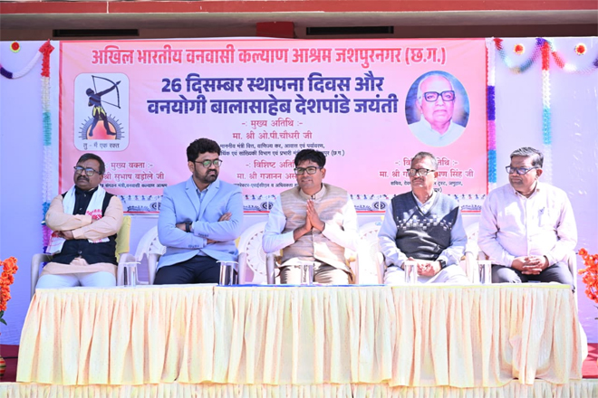 रायपुर : अखिल भारतीय वनवासी कल्याण आश्रम के 73वें स्थापना दिवस एवं संस्थापक बाला साहब देशपांडे की जयंती के अवसर पर आज कल्याण आश्रम विद्यालय परिसर में वार्षिकोत्सव एवं स्थापना दिवस समारोह का भव्य आयोजन किया गया। कार्यक्रम में मुख्य अतिथि के रूप में वित्त मंत्री श्री ओ.पी. चौधरी तथा विशिष्ट अतिथि नागपुर हाईकोर्ट के अधिवक्ता श्री गजानन असोले एवं देवमंगल मेमोरियल ट्रस्ट के सचिव श्री गोविंद नारायण सिंह उपस्थित रहे।