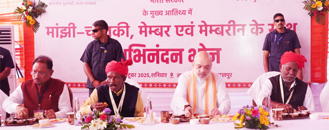 रायपुर : केन्द्रीय गृहमंत्री श्री अमित शाह एवं मुख्यमंत्री श्री विष्णु देव साय आज जगदलपुर के लालबाग मैदान में बस्तर दशहरा पर्व से जुड़े मांझी-चालकी, मेम्बर एवं मेम्बरीन के सम्मान में आयोजित अभिनंदन भोज में शामिल हुए। केंद्रीय गृह मंत्री श्री अमित शाह ने अभिनंदन भोज में परोसे गए आदिवासी समाज के पारम्परिक व्यंजनों की सराहना करते हुए कहा कि ये पारम्परिक व्यंजन बस्तर की संस्कृति, परंपरा और आदिवासी जीवन मूल्यों का अनूठा स्वाद प्रस्तुत करते हैं।