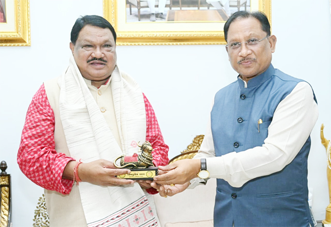 मुख्यमंत्री विष्णुदेव साय से केंद्रीय जनजातीय कार्य मंत्री जुएल ओराम ने की सौजन्य मुलाकात